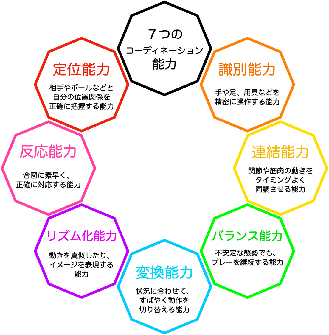 スポーツ科学の研究では、子どもの運動神経、センスを磨くために、「7つのコーディネーション能力」を磨くことが良いと主張されています。この能力は、神経系に刺激を与え、体を巧みに動かせる能力です。