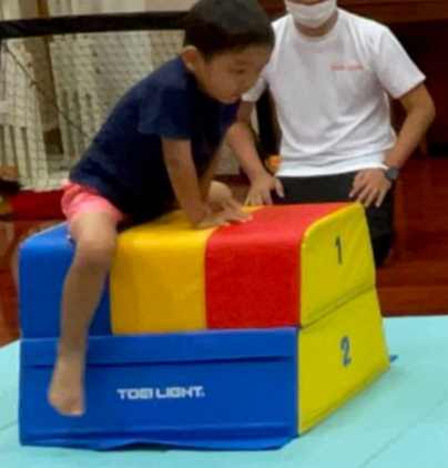 両足を揃えてジャンプすることや腕を大きく使ってジャンプすることに、挑戦します。跳び箱も取り入れ、リズム良く跳べることを目指します。